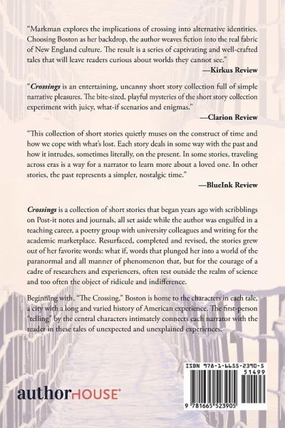 Crossings is a collection of short stories that began years ago with scribblings on Post-it notes and journals, all set aside while the author was engulfed in a teaching career, a poetry group with university colleagues and writing for the academic marketplace. Resurfaced, completed and revised, the stories grew out of her favorite words: what if, words that plunged her into a world of the paranormal and all manner of phenomenon that, but for the courage of a cadre of researchers and experiencers, often rest outside the realm of science and too often the object of ridicule and indifference. Beginning with, "The Crossing," Boston is home to the characters in each tale, a city with a long and varied history of American experience. The first-person "telling" by the central characters intimately connects each narrator with the reader in these tales of the unexpected and unexplained, a journey behind the curtain where curiosity and experience lay.