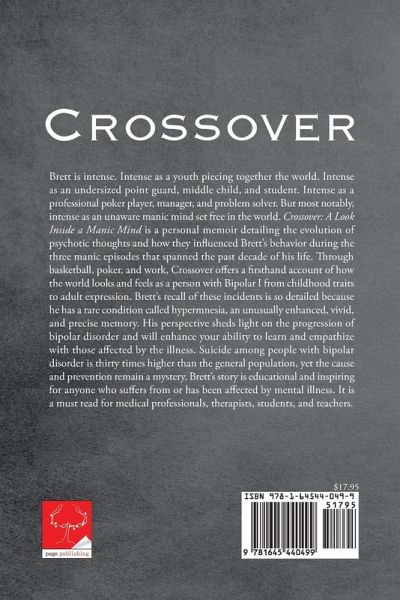Brett is intense. Intense as a youth piecing together the world. Intense as an undersized point guard, middle child, and student. Intense as a professional poker player, manager, and problem solver. But most notably, intense as an unaware manic mind set free in the world. Crossover: A Look inside a Manic Mind is a personal memoir detailing the evolution of psychotic thoughts and how they influenced Brett's behavior during the three manic episodes that spanned the past decade of his life. Through basketball, poker, and work, Crossover offers a firsthand account of how the world looks and feels as a person with Bipolar I from childhood traits to adult expression. Brett's recall of these incidents is so detailed because he has a rare condition called hypermnesia, an unusually enhanced, vivid, and precise memory. His perspective sheds light on the progression of bipolar disorder and will enhance your ability to learn and empathize with those affected by the illness. Suicide among people with bipolar disorder is thirty times higher than the general population, yet the cause and prevention remain a mystery. Brett's story is educational and inspiring for anyone who suffers from or has been affected by mental illness. It is a must read for medical professionals, therapists, students, and teachers.