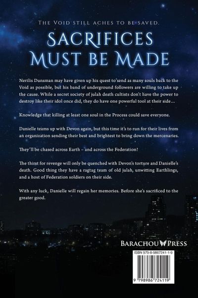 The Void still aches to be saved. Sacrifices must be made. Nerilis Dunsman may have given up his quest to send as many souls back to the Void as possible, but his band of underground followers are willing to take up the cause. While a secret society of julah death cultists don't have the power to destroy like their idol once did, they do have one powerful tool at their side... Knowledge that killing at least one soul in the Process could save everyone. Danielle teams up with Devon again, but this time it's to run for their lives from an organization sending their best and brightest to bring down the mercenaries. They'll be chased across Earth - and across the Federation! The thirst for revenge will only be quenched with Devon's torture and Danielle's death. Good thing they have a ragtag team of old julah, unwitting Earthlings, and a host of Federation soldiers on their side. With any luck, Danielle will regain her memories. Before she's sacrificed to the greater good.