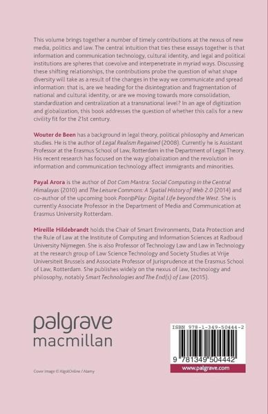 1. Introduction; Wouter de Been, Payal Arora and Mireille Hildebrandt PART I: COMMUNICATION, LAW AND POLITICS 2. From National Borders to Embedded Borderings: One Angle into the Question of Territory and Space in a Global Age; Saskia Sassen 3. Playing Around with a Few of Your Favorite Things: Freedom and Continuity on the Internet; Wouter de Been 4. The Networked Self in the Modulated Society; Julie E. Cohen 5. Fragments and Continuities of Law and ICT: A Pragmatist Approach to Understanding Legal Pluralism; Sanne Taekema PART II: NEW ICTS, IDENTITY AND LANGUAGE 6. Database Identity: Personal and Cultural Identity in the Age of Global Datafication; Jos de Mul 7. Rethinking Belonging in the Era of Social Media: Migration and Presence; Mariangela Veikou and Eugenia Siapera 8. Rule play: Negotiating Cyberspace and the Cybercultured Self in Saudi Arabia; Leigh Llewellyn Graham 9. Human-algorithmic Scaffolding; Thomas Petzold PART III: NEW ICTS AND CULTURAL INDUSTRIES 10. Has theArt Market Become Truly Global? Evidence from China and India; Femke van Hest and Filip Vermeylen 11. From Metaphysics to Metadata: Tagging as a Social Practice; Nicola Bozzi 12. National Popular Culture in an Interconnected World: The Case of Pop charts; Marc Verboord and Amanda Brandellero