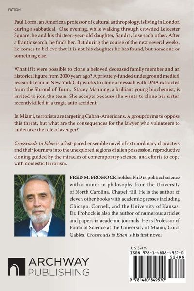 Paul Lorca, an American professor of cultural anthropology, is living in London during a sabbatical. One evening, while walking through crowded Leicester Square, he and his thirteen-year-old daughter, Sandra, lose each other. After a frantic search, he finds her. But during the course of the next several weeks, he comes to believe that it is not his daughter he has found, but someone or something else. What if it were possible to clone a beloved deceased family member and an historical figure from 2000 years ago? A privately-funded underground medical research team in New York City works to clone a messiah with DNA extracted from the Shroud of Turin. Stacey Manning, a brilliant young biochemist, is invited to join the team. She accepts because she wants to clone her sister, recently killed in a tragic auto accident. In Miami, terrorists are targeting Cuban-Americans. A group forms to oppose this threat, but what are the consequences for the lawyer who volunteers to undertake the role of avenger? Crossroads to Eden is a fast-paced ensemble novel of extraordinary characters and their journeys into the unexplored regions of alien possession, reproductive cloning guided by the miracles of contemporary science, and efforts to cope with domestic terrorism.