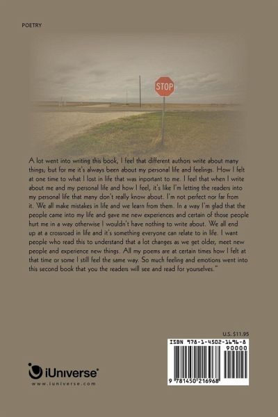 A lot went into writing this book, I feel that different authors write about many things; but for me it's always been about my personal life and feelings. How I felt at one time to what I lost in life that was inportant to me. I feel that when I write about me and my personal life and how I feel, it's like I'm letting the readers into my personal life that many don't really know about. I'm not perfect nor far from it. We all make mistakes in life and we learn from them. In a way I'm glad that the people came into my life and gave me new experiences and certain of those people hurt me in a way otherwise I wouldn't have nothing to write about. We all end up at a crossroad in life and it's something everyone can relate to in life. I want people who read this to understand that a lot changes as we get older, meet new people and experience new things. All my poems are at certain times how I felt at that time or some I still feel the same way. So much feeling and emotions went into this second book that you the readers will see and read for yourselves."