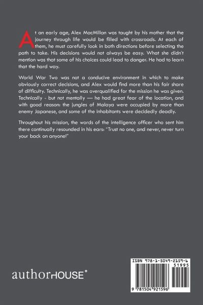 At an early age, Alex MacMillan was taught by his mother that the journey through life would be filled with crossroads. At each of them, he must carefully look in both directions before selecting the path to take. His decisions would not always be easy. What she didn't mention was that some of his choices could lead to danger. He had to learn that the hard way. World War Two was not a conducive environment in which to make obviously correct decisions, and Alex would find more than his fair share of difficulty. Technically, he was overqualified for the mission he was given. Technically - but not mentally - he had great fear of the location, and with good reason: the jungles of Malaya were occupied by more than enemy Japanese, and some of the inhabitants were decidedly deadly. Throughout his mission, the words of the intelligence officer who sent him there continually resounded in his ears: "Trust no one, and never, never turn your back on anyone!"