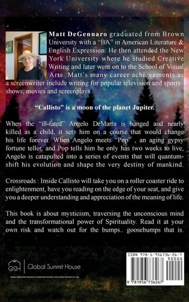"Callisto" is a moon of the planet Jupiter. When the "ill-fated" Angelo DeMarra is hanged and nearly killed as a child, it sets him on a course that would change his life forever. When Angelo meets "Pop" , an aging gypsy fortune teller, and Pop tells him he only has two weeks to live, Angelo is catapulted into a series of events that will quantum- shift his evolution and shape the very destiny of mankind. Crossroads : Inside Callisto will take you on a roller coaster ride to enlightenment, have you reading on the edge of your seat, and give you a deeper understanding and appreciation of the meaning of life. This book is about mysticism, traversing the unconscious mind and the transformational power of Spirituality. Read it at your own risk and watch out for the bumps.. goosebumps that is.