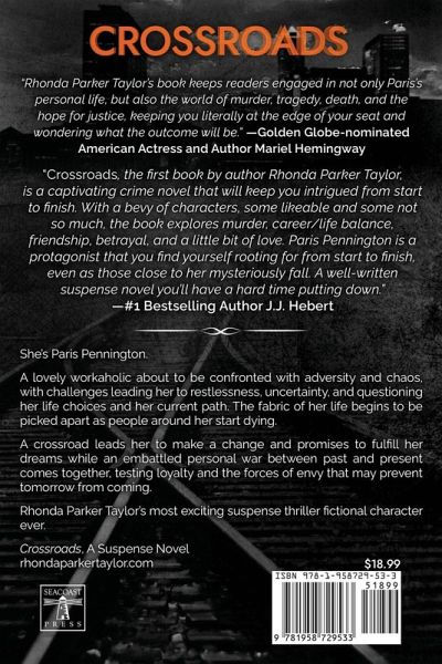 Paris Pennington, a lovely workaholic about to be confronted with adversity and chaos, with challenges leading her to restlessness, uncertainty, and questioning her life choices and her current path. The fabric of her life begins to be picked apart as people around her start dying. A crossroad leads her to make a change and promises to fulfill her dreams while an embattled personal war between past and present comes together, testing loyalty and the forces of envy that may prevent tomorrow from coming. Recommended by: Golden Globe-Nominated American Actress and Author Mariel Hemingway: "Keeps readers engaged in not only Paris's personal life, but also the world of murder, tragedy, death, and the hope for justice." And Best Selling Author J.J. Hebert states, "Paris Pennington is a protagonist that you find yourself rooting for from start to finish, even as those close to her mysteriously fall." Crossroads: A Suspense Novel rhondaparkertaylor.com