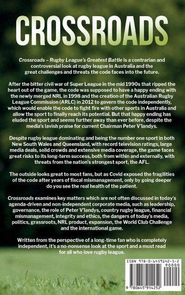 Crossroads - Rugby League's Greatest Battle is a contrarian and controversial look at rugby league in Australia and the great challenges and threats the code faces into the future. After the bitter civil war of Super League in the mid 1990s that ripped the heart out of the game, the code was supposed to have a happy ending with the newly merged NRL in 1998 and the creation of the Australian Rugby League Commission (ARLC) in 2012 to govern the code independently, which would enable the code to fight fire with other sports in Australia and allow the sport to finally reach its potential. But that happy ending has eluded the sport and seems further away than ever before, despite the media's lavish praise for current Chairman Peter V'landys. Despite rugby league dominating and being the number one sport in both New South Wales and Queensland, with record television ratings, large media deals, solid crowds and extensive media coverage, the game faces great risks to its long-term success, both from within and externally, with threats from the nation's strongest sport, the AFL. The outside looks great to most fans, but as Covid exposed the fragilities of the code after years of fiscal mismanagement, only by going deeper do you see the real health of the patient. Crossroads examines key matters which are not often discussed in today's agenda-driven and non-independent corporate media, such as leadership, governance, the role of Peter V'landys, country rugby league, financial mismanagement, integrity and ethics, the dangers of today's media, politics, grassroots, NRL product, expansion, the World Club Challenge and the international game. Written from the perspective of a long-time fan who is completely independent, it's a no-nonsense look at the sport and a must read for all who love rugby league.