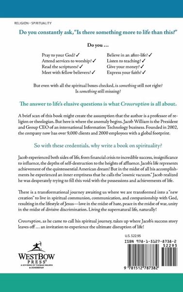Do you constantly ask, "Is there something more to life than this?" Do you... Pray to your God? ¿ Attend services to worship? ¿ Read the scriptures? ¿ Meet with fellow believers? ¿ Believe in an after-life? ¿ Listen to teaching? ¿ Give your money? ¿ Express your faith? ¿ But even with all the spiritual boxes checked, is something still not right? Is something still missing? The answer to life's elusive questions is what Crossruption is all about. A brief scan of this book might create the assumption that the author is a professor of religion or theologian. But here is where the anomaly begins. Jacob William is the President and Group CEO of an international Information Technology business. Founded in 2002, the company now has over 9,000 clients and 2000 employees with a global footprint. So with these credentials, why write a book on spirituality? Jacob experienced both sides of life, from financial crisis to incredible success, insignificance to influence, the depths of self-destruction to the heights of affluence. Jacob's life represents achievement of the quintessential American dream! But in the midst of all his accomplishments he experienced an inner emptiness that he calls the "cosmic vacuum." Jacob realized he was desperately trying to fill this void with the possessions and achievements of life. There is a transformational journey awaiting us where we are transformed into a "new creation" to live in spiritual communion, communication, and companionship with God, resulting in the lifestyle of Jesus-love in the midst of hate, peace in the midst of war, unity in the midst of divisive discrimination. Living the supernatural life, naturally! Crossruption, as he came to call his spiritual journey, takes up where Jacob's success story leaves off... an invitation to experience the ultimate disruption of life!