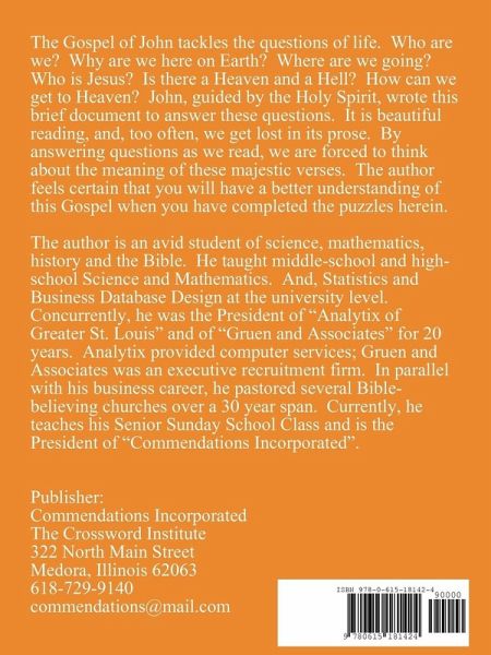 The Gospel of John tackles the questions of life. Who are we? Why are we here on Earth? Where are we going? Who is Jesus? Is there a Heaven and a Hell? How can we get to Heaven? John, guided by the Holy Spirit, wrote this brief document to answer these questions. It is beautiful reading, and, too often, we get lost in its prose. By answering questions as we read, we are forced to think about the meaning of these majestic verses. The author feels certain that you will have a better understanding of this Gospel when you have completed the puzzles herein.