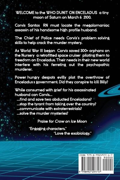 Corvis piloted a space cruise ship with hundreds of orphans from Earth. As World War III unfolded there, no one was surprised that power-hungry despots tried to invade Enceladus, an icy moon of Saturn where everything worked to produce an incredibly prosperous, hard-working, fun-loving community. Gang boss Brobding boarded Corvis's ship, but Corvis, Svet, and Billy overwhelmed and killed him, and the ship landed safely on Enceladus. A double wedding celebrated the heroes' love and their victory. Invisibly attached to a drone flying above the wedding cake, a gift exploded, thrusting a knife into Corvis's new husband's heart in front of 10,000 guests. Before this, crime was invisible on Enceladus. Corvis is recruited to help find Billy's murderer. On Earth, Corvis was strong and athletic, but he's fallen out of shape. With no training in police work, he rushes into potentially deadly situations, and he overextends himself leading to a breakdown. Enceladus's secret weapon is a colony of single-celled organisms called satendrites that can see and remember but do little else. Who would want to kill Billy, and why? What has he ever done to hurt anyone? And why do it so publicly? Other disappearances and murders follow. Corvis is paired with Bert, the new cop and primary investigator in Billy's murder. Over time, they fall in love. Billy was Apprentice Dragomark, the one who speaks for the satendrites. That office must now be filled. Blind, soon-to-be 18-year-old Mary is chosen. She arrived on Enceladus with Corvis. She falls in love with Kelly, a communications worker who is also blind and turns out to be creepy and gang related. Mary helps find and recover two Enceladans. A previously unknown alien, Aqit, abducted Erwan and Kevin. Corvis's visit to Tethys, another moon of Saturn, with the Aqit, raises the scepter of other intelligent extraterrestrials who might not be so friendly. Corvis meets the shady gang boss Typhoon, AKA Pearl, AKA Persephata. She kidnaps Mary and demands money and then a prime spot in the government of the community. It seems the mystery has been solved, but after her death, murders and demands continue. Representative Hurd, the third most powerful individual on Enceladus is the prime suspect. When Persephata attempts to murder Mary, Persephata is killed by a single sharpshooter's bullet. Hurd tries to escape through the sewers, and when caught commits suicide. Brobding, Persephata, and Hurd all had metallic tattoos that no human could produce, given to them in exchange for their commitment to helping the Dromish conquer all humans in the solar system. Can all the people Corvis has hurt ever forgive him? Will Corvis remarry? Will Mary become Dragomark?