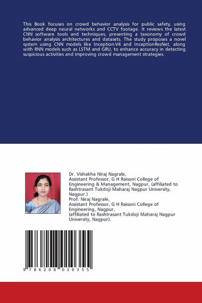 This Book focuses on crowd behavior analysis for public safety, using advanced deep neural networks and CCTV footage. It reviews the latest CNN software tools and techniques, presenting a taxonomy of crowd behavior analysis architectures and datasets. The study proposes a novel system using CNN models like Inception-V4 and InceptionResNet, along with RNN models such as LSTM and GRU, to enhance accuracy in detecting suspicious activities and improving crowd management strategies.