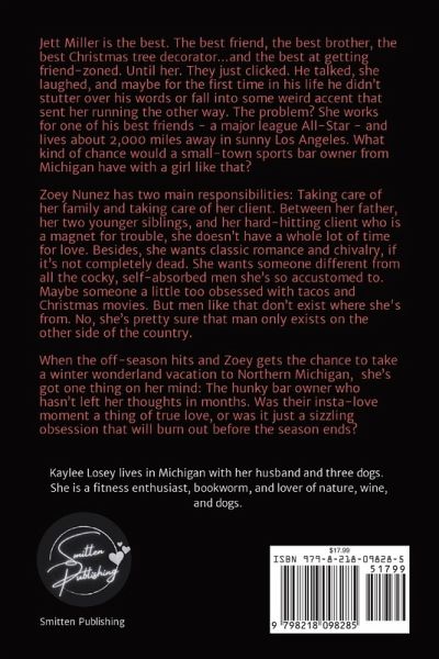 Jett Miller is the best. The best friend, the best brother, the best Christmas tree decorator...and the best at getting friend-zoned. Until her. They just clicked. He talked, she laughed, and maybe for the first time in his life he didn't stutter over his words or fall into some weird accent that sent her running the other way. The problem? She works for one of his best friends - a major league All-Star - and lives about 2,000 miles away in sunny Los Angeles. What chance does a small-town sports bar owner from Michigan have with a girl like that? Zoey Nunez has two main responsibilities: Taking care of her family and taking care of her client. Between her father, her two younger siblings, and her hard-hitting client who is a magnet for trouble, she doesn't have a whole lot of time for romance. Besides, she wants classic romance and chivalry, if it's not completely dead. She wants someone different from all the cocky, self-absorbed men she's so accustomed to. Maybe someone a little too obsessed with tacos and Christmas movies. But men like that don't exist where she's from. No, she's pretty sure that man only exists on the other side of the country. When the off-season hits and Zoey gets the chance to take a winter wonderland vacation to Northern Michigan, she's got one thing on her mind: The hunky bar owner who hasn't left her thoughts in months. Was their insta-love moment a thing of true love, or was it just a sizzling obsession that will burn out before the season ends?
