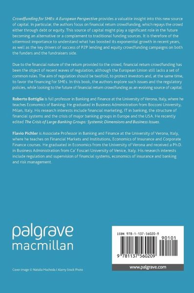 Crowdfunding for SMEs: A European Perspective provides a valuable insight into this new source of capital. Inparticular, the authors focus on financial return crowdfunding, which repaysthe crowd either through debt or equity. This source of capital might play asignificant role in the future becoming an alternative or a complement totraditional funding sources. It is therefore of the uttermost importance tounderstand what has boosted its exponential growth in recent years, as well asthe key drivers of success of P2P lending and equity crowdfunding campaigns onboth the funders and the fundraisers side.