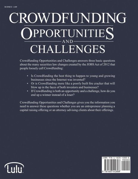 Crowdfunding Opportunities and Challenges answers three basic questions about the many securities law changes created by the JOBS Act of 2012 that people loosely call Crowdfunding: Is Crowdfunding the best thing to happen to young and growing businesses since the Internet was invented? Or is Crowdfunding more like a poorly built fire cracker that will blow up in the faces of both investors and businesses? If Crowdfunding is both an opportunity and a challenge, how do you end up a winner instead of a loser? Crowdfunding Opportunities and Challenges gives you the information you need to answer these questions whether you are an entrepreneur planning a capital raising offering or an attorney advising clients about their offerings.
