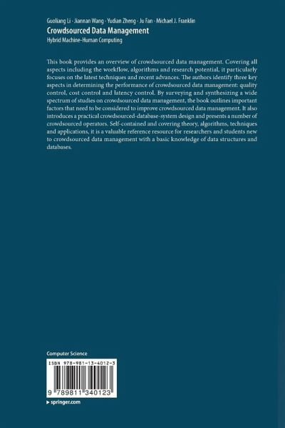 This book provides an overview of crowdsourced data management. Covering all aspects including the workflow, algorithms and research potential, it particularly focuses on the latest techniques and recent advances. The authors identify three key aspects in determining the performance of crowdsourced data management: quality control, cost control and latency control. By surveying and synthesizing a wide spectrum of studies on crowdsourced data management, the book outlines important factors that need to be considered to improve crowdsourced data management. It also introduces a practical crowdsourced-database-system design and presents a number of crowdsourced operators. Self-contained and covering theory, algorithms, techniques and applications, it is a valuable reference resource for researchers and students new to crowdsourced data management with a basic knowledge of data structures and databases.