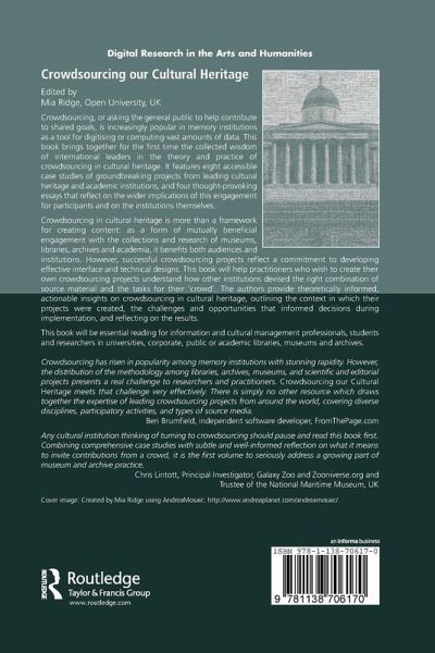 Crowdsourcing, or asking the general public to help contribute to shared goals, is increasingly popular in memory institutions as a tool for digitising or computing vast amounts of data. This book brings together for the first time the collected wisdom of international leaders in the theory and practice of crowdsourcing in cultural heritage. It features eight accessible case studies of groundbreaking projects from leading cultural heritage and academic institutions, and four thought-provoking essays that reflect on the wider implications of this engagement for participants and on the institutions themselves. Crowdsourcing in cultural heritage is more than a framework for creating content: as a form of mutually beneficial engagement with the collections and research of museums, libraries, archives and academia, it benefits both audiences and institutions. However, successful crowdsourcing projects reflect a commitment to developing effective interface and technical designs. This book will help practitioners who wish to create their own crowdsourcing projects understand how other institutions devised the right combination of source material and the tasks for their 'crowd'. The authors provide theoretically informed, actionable insights on crowdsourcing in cultural heritage, outlining the context in which their projects were created, the challenges and opportunities that informed decisions during implementation, and reflecting on the results. This book will be essential reading for information and cultural management professionals, students and researchers in universities, corporate, public or academic libraries, museums and archives.