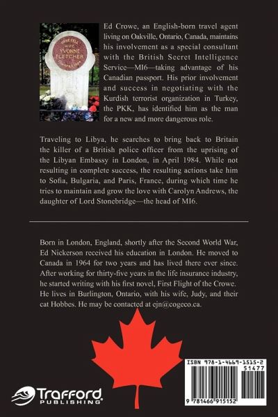 Ed Crowe, an English-born travel agent living on Oakville, Ontario, Canada, maintains his involvement as a special consultant with the British Secret Intelligence Service-MI6-taking advantage of his Canadian passport. His prior involvement and success in negotiating with the Kurdish terrorist organization in Turkey, the PKK, has identified him as the man for a new and more dangerous role. Traveling to Libya, he searches to bring back to Britain the killer of a British police officer from the uprising of the Libyan Embassy in London, in April 1984. While not resulting in complete success, the resulting actions take him to Sofia, Bulgaria, and Paris, France, during which he tries to maintain and grow the love with Carolyn Andrews, the daughter of Lord Stonebridge-the head of MI6.