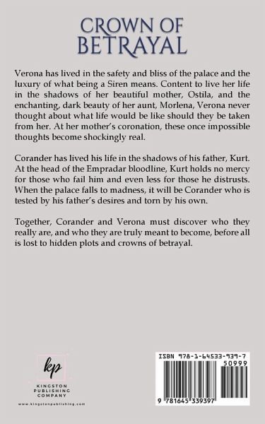 Verona has lived in the safety and bliss of the palace and the luxury of what being a Siren means. Content to live her life in the shadows of her beautiful mother, Ostila, and the enchanting, dark beauty of her aunt, Morlena, Verona never thought about what life would be like should they be taken from her. At her mother's coronation, these once impossible thoughts become shockingly real. Corander has lived his life in the shadows of his father, Kurt. At the head of the Empradar bloodline, Kurt holds no mercy for those who fail him and even less for those he distrusts. When the palace falls to madness, it will be Corander who is tested by his father's desires and torn by his own. Together, Corander and Verona must discover who they really are, and who they are truly meant to become, before all is lost to hidden plots and crowns of betrayal.