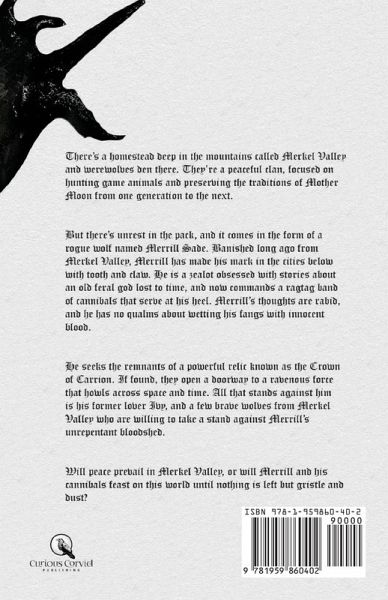 There's a homestead deep in the mountains called Merkel Valley and werewolves den there. They're a peaceful clan, focused on hunting game animals and preserving the traditions of Mother Moon from one generation to the next. But there's unrest in the pack, and it comes in the form of a rogue wolf named Merrill Sade. Banished long ago from Merkel Valley, Merrill has made his mark in the cities below with tooth and claw. He is a zealot obsessed with stories about an old feral god lost to time, and now commands a ragtag band of cannibals that serve at his heel. Merrill's thoughts are rabid, and he has no qualms about wetting his fangs with innocent blood. He seeks the remnants of a powerful relic known as the Crown of Carrion. If found, they open a doorway to a ravenous force that howls across space and time. All that stands against him is his former lover Ivy, and a few brave wolves from Merkel Valley who are willing to take a stand against Merrill's unrepentant bloodshed. Will peace prevail in Merkel Valley, or will Merrill and his cannibals feast on this world until nothing is left but gristle and dust? "Jeremy Megargee is a force to be reckoned with. He seamlessly blends genre and literary - like a rose, his writing is beauty enshrouded by thorns. Crown of Carrion is exactly that; horror that bleeds humanity. Megargee is unflinching in his brutality, giving readers the carnality of lycanthropy that they have been begging to see." - Sabrina Voerman (she/her) author of "The Blood Bound Series"