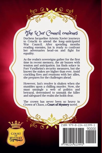 The War Council convenes... Duchess Jacqueline Arienta Xavier makes her way north to the wilds of Cetachi to attend the long-awaited War Council. After spending the last several months evading her enemies, Jax is ready to face her adversaries head-on to fight for equality and freedom throughout the Realm of Virtues. With the sovereigns of the realm gathered together for the first time in recent memory, Jax is prepared for anything to happen... ...except stumbling across a grisly murder. The crown has never been so heavy in Crown of Chaos. Discover more of Duchess Jacqueline's adventures in the Court of Mystery, an enchanting series full of fantastical intrigue.