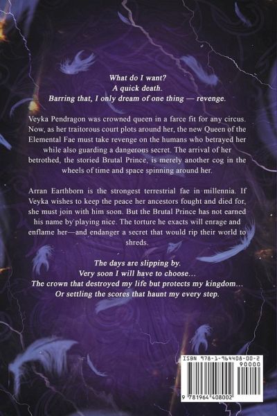 What do I want? A quick death. Barring that, I only dream of one thing-revenge. Veyka Pendragon was crowned queen in a farce fit for any circus. Now, as her traitorous court plots around her, the new Queen of the Elemental Fae must take revenge on the humans who betrayed her while also guarding a dangerous secret. The arrival of her betrothed, the storied Brutal Prince, is merely another cog in the wheels of time and space spinning around her. Arran Earthborn is the strongest terrestrial fae in millennia. If Veyka wishes to keep the peace her ancestors fought and died for, she must join with him soon. But the Brutal Prince has not earned his name by playing nice. The torture he exacts will enrage and enflame her-and endanger a secret that would rip their world to shreds. The days are slipping by. Very soon I will have to choose... The crown that destroyed my life but protects my kingdom... Or settling the scores that haunt my every step. Crown of Earth and Sky is a twisted mythology retelling of the Arthur legend. It is a high-steam fantasy romance with dark elements.