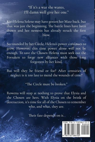 "If it's a war she wants, I'll damn well give her one." Kiri Helena Solene may have gotten her Mate back, but that was just the beginning. The battle lines have been drawn and her nemesis has already struck the first blow. Surrounded by her Circle, Helena's power continues to grow. However, this time power alone will not be enough. To save the Chosen Helena must seek out the Forsaken to forge new alliances with those long forgotten by her kind. But will they be friend or foe? After centuries of neglect is it too late to mend the wounds of time? "The Circle must be broken." Rowena will stop at nothing to prove that Elysia and the Chosen are hers. With Elysia on the brink of destruction, it's time for all of the Chosen to remember who, and what, they are. Their fate depends on it.