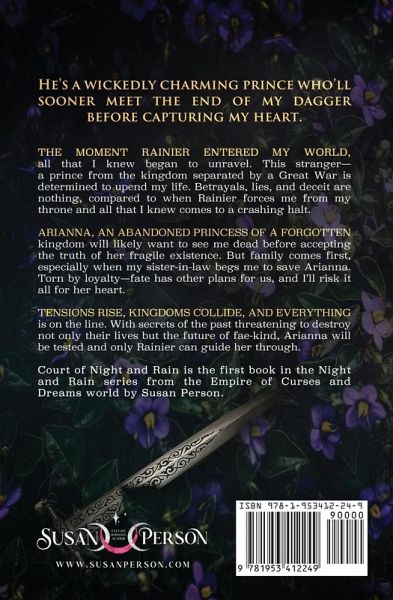 He's a wickedly charming prince who'll sooner meet the end of my dagger before capturing my heart. The moment Rainier entered my world, all that I knew began to unravel. This stranger-a prince from the kingdom separated by a Great War is determined to upend my life. Betrayals, lies, and deceit are nothing, compared to when Rainier forces me from my throne and all that I knew comes to a crashing halt. Arianna, an abandoned princess of a forgotten kingdom will likely want to see me dead before accepting the truth of her fragile existence. But family comes first, especially when my sister-in-law begs me to save Arianna. Torn by loyalty-fate has other plans for us, and I'll risk it all for her heart. Tensions rise, kingdoms collide, and everything is on the line. With secrets of the past threatening to destroy not only their lives but the future of fae-kind, Arianna will be tested and only Rainier can guide her through. Crown of Night and Rain is the first book in the Night and Rain series from the Empire of Curses and Dreams world by Susan Person.