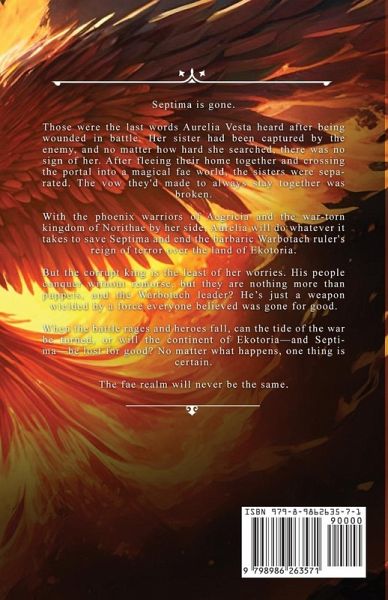 Septima is gone. Those were the last words Aurelia Vesta heard after being wounded in battle. Her sister had been captured by the enemy, and no matter how hard she searched, there was no sign of her. After fleeing their home together, and crossing the portal into a magical fae world, the sisters were separated. The vow they'd made to always stay together was broken. With the phoenix warriors of Aegrica, and the rebuilding kingdom of Norithae by her side, Aurelia will do whatever it takes to save Septima and defeat the barbaric Warbotach ruler who reigns terror throughout the land of Ekotoria.…mehr