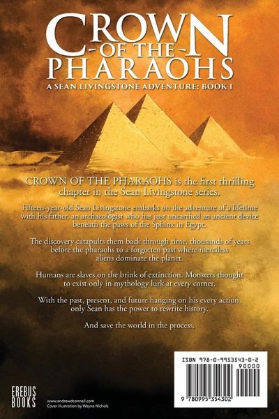 Worn by the pharaohs... Created by aliens... It's the most powerful crown the world has ever seen! Fifteen-year-old Sean Livingstone is on the adventure of a lifetime, visiting his dad, an archaeologist who has just discovered an ancient alien device beneath the Sphinx - a find that reveals a forgotten chapter in human history, placing everything we know about life on Earth into question. But they're not the first to uncover the truth. A reclusive billionaire and his assassins will stop at nothing to keep the revelation a secret from the rest of the world. Running for his life, Sean is catapulted out of time and place - into a world where humans live on the brink of extinction, dominated by aliens and their monstrous hybrid creations. With the past, present, and future hanging in the balance, only Sean can unlock the power of the pharaohs crown and save humanity. Crown of the Pharaohs is perfect for fans of young adult science-fiction and action-adventure. It's a fascinating blend of time travel, alien invasions, Egyptian and Greek mythology; incorporating themes of personal loss, coming of age, and family values within a framework of classic myths and legends. Teens and adults alike are bound to be captivated by this amazing adventure.