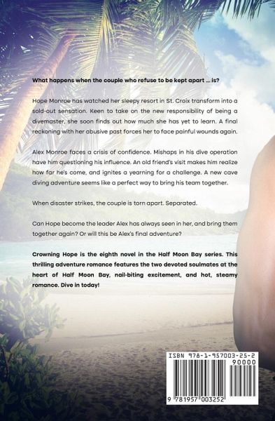 What happens when the couple who refuse to be kept apart ... is? Hope Monroe has watched her sleepy resort in St. Croix transform into a sold-out sensation. Keen to take on the new responsibility of being a divemaster, she soon finds out how much she has yet to learn. A final reckoning with her abusive past forces her to face painful wounds again. Alex Monroe faces a crisis of confidence. Mishaps in his dive operation have him questioning his influence. An old friend's visit makes him realize how far he's come, and ignites a yearning for a challenge. A new cave diving adventure seems like a perfect way to bring his team together. When disaster strikes, the couple is torn apart. Separated. Can Hope become the leader Alex has always seen in her, and bring them together again? Or will this be Alex's final adventure? Crowning Hope is the eighth novel in the Half Moon Bay series. This thrilling adventure romance features the two devoted soulmates at the heart of Half Moon Bay, nail-biting excitement, and hot, steamy romance. Dive in today!