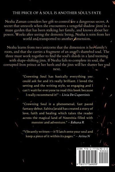 The price of a soul is another soul's fate. Be swept away in this unique fantasy debut from Sahira Javaid. A spellbinding adventure of belonging, family and hope. Perfect for fans of InuYasha, Children of Blood and Bone and The Candle and The Flame. Nezha Zaman considers her gift to control fire a dangerous secret. A secret that unravels when she encounters a vengeful shadow jinni in a maze garden that has been stalking her family, and knows about her power. Weeks after seeing the demonic being, Nezha is torn from her world and transported to another dimension. Nezha learns from two unicorns that the dimension is her family's roots, and that she carries a fragment of an angel's shattered soul. The three must work together to find the soul's shards in a land teeming with shape-shifting jinn. If Nezha fails to complete its soul, the corrupted Iron prince at her heels and the jinn will her shatter her soul next.