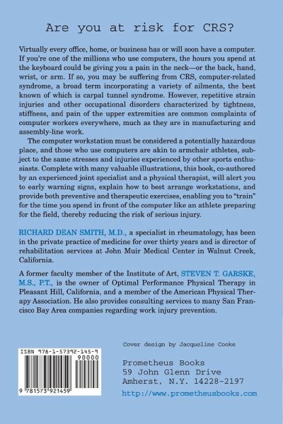 If you're one of the millions who use computers at work or at home, the hours you spend in front of the monitor could be giving you a pain in the neck, back, hand, wrist, or arm. If so, you may be suffering from CRS. Tightness, stiffness, and pain of the upper extremities are common complaints of writers and computer users. Carpal tunnel pain, repetitive strain injuries, occupational disorders of the upper extremities, and other problems related to heavy keyboard and computer use have spread across the nation as computers become indispensable at work and at home. Classified under the rubric "computer-related syndrome," or CRS for short, these injuries have caused a work slowdown, while creating a whole field of medical exploration. CRS: The Prevention & Treatment of Computer-Related Injuries by rheumatologist Dr. Richard Dean Smith and physical therapist Steve Garske calls attention to the common problems of computer use and offers practical advice and helpful hints intended to lessen the risk of sustaining injuries related to posture, rapid movements, and positional errors common to writers, computer users, and other occupations. Everyone needs to be informed of the dangers involved, as well as successful prevention techniques and helpful remedies when injury does occur. The book includes a history of CRS, information on symptoms, clinical findings, effects on work, and where to get help.
