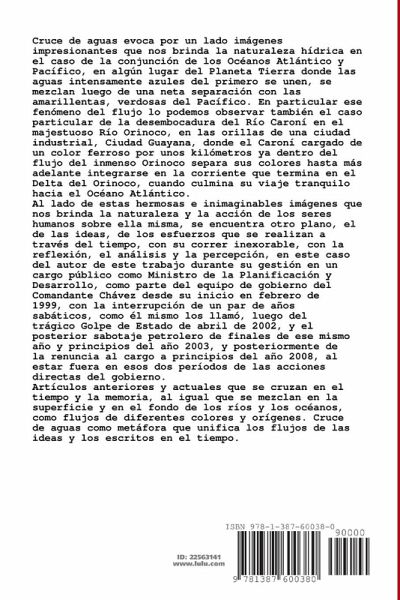 Cruce de aguas evoca por un lado imágenes impresionantes que nos brinda la naturaleza hídrica en el caso de la conjunción de los Océanos Atlántico y Pacífico, en algún lugar del Planeta Tierra donde las aguas intensamente azules del primero se unen, se mezclan luego de una neta separación con las amarillentas, verdosas del Pacífico. En particular ese fenómeno del flujo lo podemos observar también el caso particular de la desembocadura del Río Caroní en el majestuoso Río Orinoco, en las orillas de una ciudad industrial, Ciudad Guayana, donde el Caroní cargado de un color ferroso por unos kilómetros ya dentro del flujo del inmenso Orinoco separa sus colores hasta más adelante integrarse en la corriente que termina en el Delta del Orinoco, cuando culmina su viaje tranquilo hacia el Océano Atlántico.