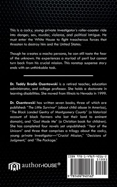 This is a cocky, young private investigator’s roller-coaster ride into danger, sex, murder, violence, and political intrigue. He must enter the White House to fight treacherous forces that threaten to destroy him and the United States. Though he creates a macho persona, he can still taste the fear of the unknown. He experiences a myriad of peril but cannot turn back from his crucial mission. This nonstop suspense story ends with an unthinkable task.