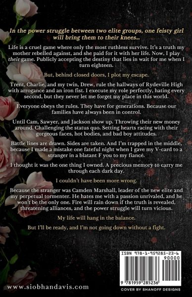 In the power struggle between two elite groups, one feisty girl will bring them to their knees... Life is a cruel game where only the most ruthless survive. It's a truth my mother rebelled against, and she paid for it with her life. Now, I play their game. Publicly accepting the destiny that lies in wait for me when I turn eighteen. But, behind closed doors, I plot my escape. Trent, Charlie, and my twin, Drew, rule the hallways of Rydeville High with arrogance and an iron fist. I execute my role perfectly, hating every second, but they never let me forget my place in this world. Everyone obeys the rules. They have for generations. Because our families have always been in control. Until Cam, Sawyer, and Jackson show up. Throwing their new money around. Challenging the status quo. Setting hearts racing with their gorgeous faces, hot bodies, and bad boy attitudes. Battle lines are drawn. Sides are taken. And I'm trapped in the middle, because I made a mistake one fateful night when I gave my V-card to a stranger in a blatant F you to my fiancé. I thought it was the one thing I owned. A precious memory to carry me through each dark day. I couldn't have been more wrong. Because the stranger was Camden Marshall, leader of the new elite and my perpetual tormenter. He hates me with a passion unrivaled, and he won't be the only one. Fire will rain down if the truth is revealed, threatening alliances, and the power struggle will turn vicious. My life will hang in the balance. But I'll be ready, and I'm not going down without a fight. Due to mature content and themes this book is recommended to readers eighteen and over.