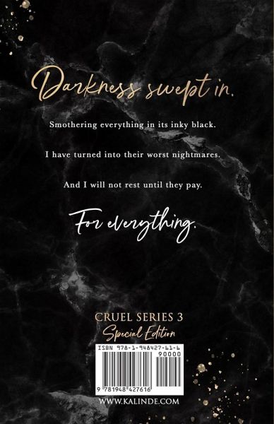 Watch Natalie get revenge in her new dark and glamorous life on the Upper East Side in the conclusion to USA Today bestselling author K.A. Linde's billionaire romance Cruel Trilogy. Darkness swept in. Smothering everything in its inky black. I have turned into their worst nightmares. And I will not rest until they pay. For everything. Special edition paperback includes the original short story, One Cruel Letter.