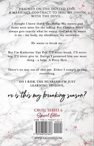 A sexy arranged marriage romance from USA Today bestselling author K.A. Linde... I signed on the dotted line. A marriage contract to seal my union with the devil. I thought I knew what I was doing. His money and name were mine for the taking. But Camden Percy always gets exactly what he wants. And what he wants is me-my body, my obedience, my surrender. But I'm Katherine Van Pelt. I'll never break. I'll never beg. I'll never give in. Except I promised him one more thing-a baby. A Percy heir. There's no way out of this one. Either I comply or lose everything. Do I risk the husband I'm just learning to love or will I finally breakdown in this cruel marriage? Special edition paperback includes the original novella, One Cruel Wedding Night.