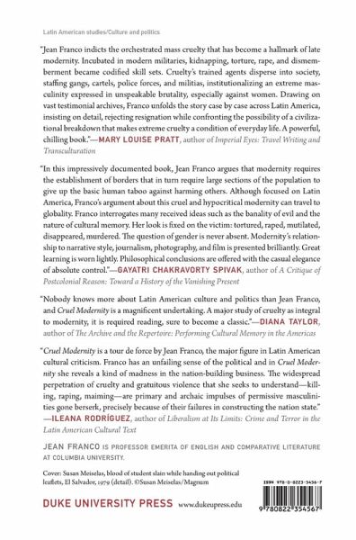 In Cruel Modernity, Jean Franco examines the conditions under which extreme cruelty became the instrument of armies, governments, rebels, and rogue groups in Latin America. She seeks to understand how extreme cruelty came to be practiced in many parts of the continent over the last eighty years and how its causes differ from the conditions that brought about the Holocaust, which is generally the atrocity against which the horror of others is measured. In Latin America, torturers and the perpetrators of atrocity were not only trained in cruelty but often provided their own rationales for engaging in it. When "draining the sea" to eliminate the support for rebel groups gave license to eliminate entire families, the rape, torture, and slaughter of women dramatized festering misogyny and long-standing racial discrimination accounted for high death tolls in Peru and Guatemala. In the drug wars, cruelty has become routine as tortured bodies serve as messages directed to rival gangs. Franco draws on human-rights documents, memoirs, testimonials, novels, and films, as well as photographs and art works, to explore not only cruel acts but the discriminatory thinking that made them possible, their long-term effects, the precariousness of memory, and the pathos of survival.