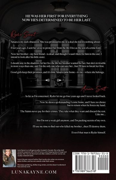 HE WAS HER FIRST FOR EVERYTHING. NOW HE'S DETERMINED TO BE HER LAST. RYDER SAINT Amara is my dark obsession. She was promised to me in a deal she knows nothing about. Four years ago, I sent her away to protect her from the life I live as the son of a crime lord. Now her brother-my best friend-is dead, and though I wasn't there for him in the end, I intend to look after his little sister. I should stay in the shadows, let her live the life her brother wanted for her, but she's in trouble in more ways than one, and I'm the only one who can save her...but I'll have to break her first. Good girls keep their promises, and it's time Amara came home-to me-where she belongs. AMARA SCOTT As far as I'm concerned, Ryder let me go four years ago, and I never looked back. Now he shows up demanding I come home, and I have no choice but to return when he forces my hand. The Saints never pay for their crimes. They take what they want and discard the rest. Like me... But I'm not a weak girl anymore, and I'm packing some secrets of my own. I'll use my time to find out who killed my brother...then I'll destroy them. Even if that man is Ryder himself. * Cruel Saint is the first book in the Vicious Empire dark romance family saga series.