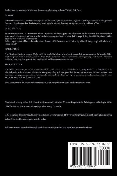 Read four more stories of judicial horror from the award-winning author of Cryptic, Erik Dean. DUMMY Robert Holman failed to heed the warnings and an innocent night out turns into a nightmare. What punishment is fitting for this Dummy? He realizes too late that being sorry is not enough, and that there's no hiding from the vengeful hand of fate. EARLY RELEASE An amendment to the US Constitution allows for grieving families to apply for Early Release for the prisoners who murdered their loved ones. The prisoner is set loose and the family has twenty-four hours to exact their revenge. If they don't kill the prisoner within 24 hours, they're awarded their freedom. Kelvin Heyer, a bank robber, is the lucky winner this time. Will he outrun his victim's vengeful family long enough with a little help from a Friend? PUBLIC POOL Best friends and business partners Carlos and Luis are thrilled when their swimming pool design company wins the lucrative bid to build new public pools in Phoenix, Arizona. Their delight is spoiled by a business rival and Carlos's growing-and mutual-attraction to Maria, Luis's wife. Lust, passion, and greed quickly build up to murder and betrayal. BROKEN JUSTICE In the future, trials take place in small pods instead of courtrooms and most cars are driverless. Holly Barlow is one of the few people who still prefer to drive her own car, but she is caught speeding and must pay a fine. She quickly learns that the court pods do more than simply accept payments for fines-they can also vaporize lawbreakers, carrying out executions instantly... and automated systems are known to break down from time to time. From courtrooms of the present and into the future, you'll enjoy these ironic and horrific tales with a twist.