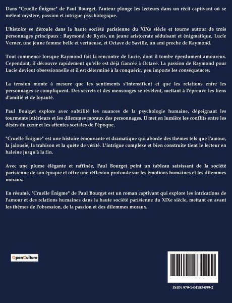 Dans "Cruelle Énigme" de Paul Bourget, l'auteur plonge les lecteurs dans un récit captivant où se mêlent mystère, passion et intrigue psychologique. L'histoire se déroule dans la haute société parisienne du XIXe siècle et tourne autour de trois personnages principaux : Raymond de Ryeis, un jeune aristocrate séduisant et énigmatique, Lucie Verner, une jeune femme belle et vertueuse, et Octave de Saville, un ami proche de Raymond. Tout commence lorsque Raymond fait la rencontre de Lucie, dont il tombe éperdument amoureux. Cependant, il découvre rapidement qu'elle est déjà fiancée à Octave. La passion de Raymond pour Lucie devient obsessionnelle et il est déterminé à la conquérir, peu importe les conséquences. La tension monte à mesure que les sentiments s'intensifient et que les relations entre les personnages se compliquent. Des secrets et des mensonges se révèlent, mettant à l'épreuve les liens d'amitié et de loyauté. Paul Bourget explore avec subtilité les nuances de la psychologie humaine, dépeignant les tourments intérieurs et les dilemmes moraux des personnages. Il met en lumière les conflits entre les désirs du c¿ur et les attentes sociales de l'époque. "Cruelle Énigme" est une histoire émouvante et dramatique qui aborde des thèmes tels que l'amour, la jalousie, la trahison et la quête de vérité. L'intrigue complexe et bien construite tient le lecteur en haleine jusqu'à la fin. Avec une plume élégante et raffinée, Paul Bourget peint un tableau saisissant de la société parisienne de son époque et offre une réflexion profonde sur les émotions humaines et les dilemmes moraux. En résumé, "Cruelle Énigme" de Paul Bourget est un roman captivant qui explore les intrications de l'amour et des relations humaines dans la haute société parisienne du XIXe siècle, mettant en avant les thèmes de l'obsession, de la passion et des dilemmes moraux.