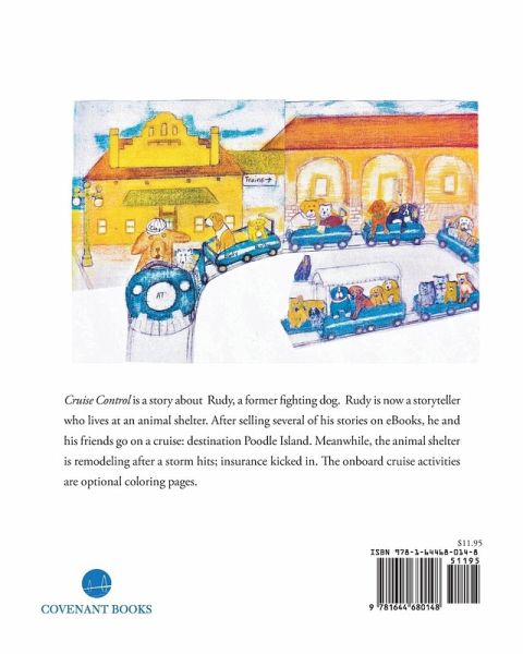 Cruise Control is a story about Rudy, a former fighting dog. Rudy is now a storyteller who lives at an animal shelter. After selling several of his stories on eBooks, he and his friends go on a cruise: destination Poodle Island. Meanwhile, the animal shelter is remodeling after a storm hits; insurance kicked in. The onboard cruise activities are optional coloring pages.
