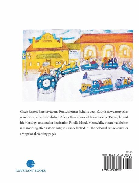 Cruise Control is a story about Rudy, a former fighting dog. Rudy is now a storyteller who lives at an animal shelter. After selling several of his stories on eBooks, he and his friends go on a cruise: destination Poodle Island. Meanwhile, the animal shelter is remodeling after a storm hits; insurance kicked in. The onboard cruise activities are optional coloring pages.