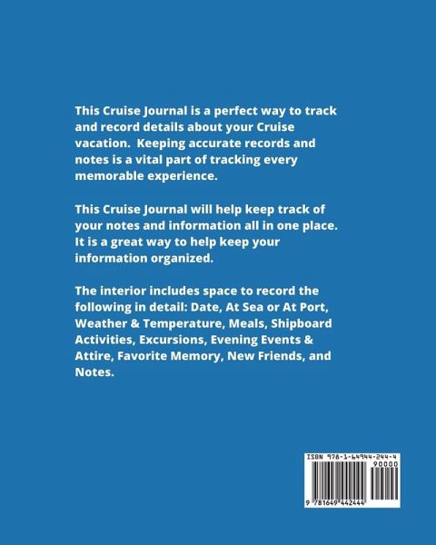 This Cruise Journal book/ diary is a great way to write down and record all of your memories, activities and adventures on your cruise vacation. If you're a planner and planning a cruise, this journal is something you need to take with you and use. Whether you're going with friends and family, for work or anything else, you will want to write in this every day. There will be so much to see and do, you don't want to forget a single moment. This will be a memory keepsake that you will treasure for years to come and look back on. Each page has prompts to fill in which include space for: Date, At Sea or Port Weather & Temperature Meals - Restaurant & Meals For Breakfast, Lunch Dinner Shipboard Activities Excursions Evening Events & Attire Favorite Memory New Friends Don't Forget - Blank Lined For Notes & Writing Important Information Or Thoughts Will make a perfect gift for anyone going on a cruise. Easy enough for kids to use. There's enough room for several cruise ship vacations. Size is 8x10 inches, 102 pages, soft matte finish cover, quality white paper, paperback. Great for Christmas or birthday. Get one today and start packing for all that fun and adventure!