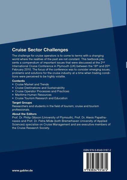 The challenge for cruise operators is to come to terms with a changing world where the realities of the past are not constant. This textbook presents a compendium of important issues that were discussed at the 2nd International Cruise Conference in Plymouth (UK) between the 18th and 20th February 2010. The focus of the conference was to consider emerging issues, problems and solutions for the cruise industry at a time when trading conditions were perceived to be highly volatile.