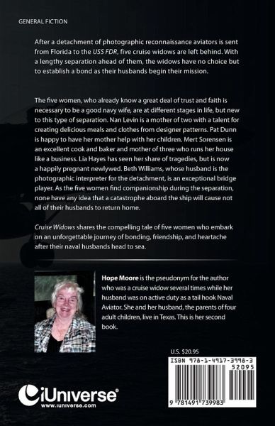 After a detachment of photographic reconnaissance aviators is sent from Florida to the USS FDR, five cruise widows are left behind. With a lengthy separation ahead of them, the widows have no choice but to establish a bond as their husbands begin their mission. The five women, who already know a great deal of trust and faith is necessary to be a good navy wife, are at different stages in life, but new to this type of separation. Nan Levin is a mother of two with a talent for creating delicious meals and clothes from designer patterns. Pat Dunn is happy to have her mother help with her children. Mert Sorensen is an excellent cook and baker and mother of three who runs her house like a business. Lia Hayes has seen her share of tragedies, but is now a happily pregnant newlywed. Beth Williams, whose husband is the photographic interpreter for the detachment, is an exceptional bridge player. As the five women find companionship during the separation, none have any idea that a catastrophe aboard the ship will cause not all of their husbands to return home. Cruise Widows shares the compelling tale of five women who embark on an unforgettable journey of bonding, friendship, and heartache after their naval husbands head to sea.