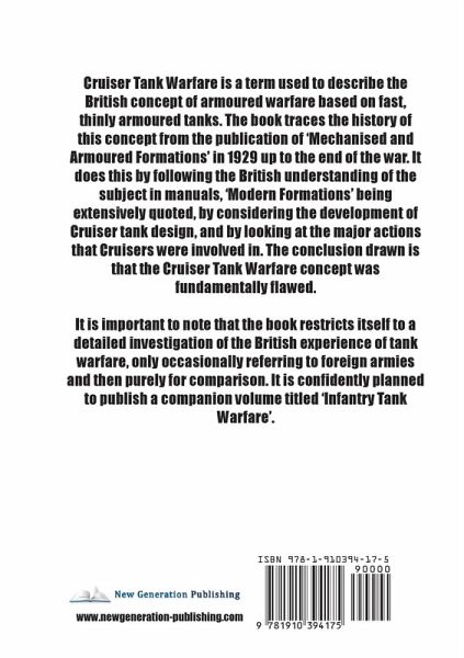 Cruiser Tank Warfare is a term used to describe the British concept of armoured warfare based on fast, thinly armoured tanks. The book traces the history of this concept from the publication of 'Mechanised and Armoured Formations' in 1929 up to the end of the war. It does this by following the British understanding of the subject in manuals, 'Modern Formations' being extensively quoted, by considering the development of Cruiser tank design, and by looking at the major actions that Cruisers were involved in. The conclusion drawn is that the Cruiser Tank Warfare concept was fundamentally flawed. It is important to note that the book restricts itself to a detailed investigation of the British experience of tank warfare, only occasionally referring to foreign armies and then purely for comparison. It is confidently planned to publish a companion volume titled 'Infantry Tank Warfare'.