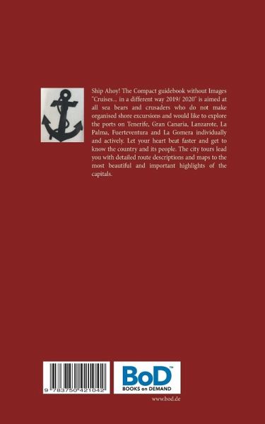 Ship Ahoy! The Compact guidebook without Images "Cruises... in a different way 2019/ 2020" is aimed at all sea bears and crusaders who do not make organised shore excursions and would like to explore the ports on Tenerife, Gran Canaria, Lanzarote, La Palma, Fuerteventura and La Gomera individually and actively. Let your heart beat faster and get to know the country and its people. The city tours lead you with detailed route descriptions and maps to the most beautiful and important highlights of the capitals. On Tenerife in the capital Santa Cruz de Tenerife you dive directly into the exciting history of conquest of the Canary Islands. Under the Plaza España you look at ancient ruins of the Castillo San Cristóbal and the legendary cannon El Tigre with which the forearm of Nelson was shot down. In the Iglesia de la Concepción you can see the wooden cross that rammed Alonso de Lugo into the ground after the conquest. Culturally you get your money's worth in the museums MUNA with mummies, in the TEA, the La Recova and the Museo de Bellas Artes. Follow the carnival fools at Casa de Carnaval as they celebrate the 2nd largest carnival in the world. Don't miss the auditorium, the landmark of Santa Cruz. You can enjoy pure relaxation in the magnificent Parque Maritimo with its seawater swimming pool or in Playa de Las Teresitas. Relax in the 12-hectare Palmetum Botanic Garden or mingle with locals at the popular Plaza Weyler, Plaza de Los Patos and Parque Garcia Sanabria. Arrive in Las Palmas de Gran Canaria and dive into the exciting underwater world of Poema del Mar, or take a refreshing dip in the award-winning Playa de Las Canteras. Wake up your thirst for discovery in the old town of La Vegueta. Here you will find the magnificent Basílica de Santa Ana Cathedral, the Museo Canario with Skulls, the Columbus House Casa Colón, the CAAM Art Centre, the historical Gabinete Literario Literature Cabinet and the pretty Palacete Rodriguez Queguez Palace.From Arrecife, on the black volcanic island of Lanzarote, you begin your visit with a walk around the picturesque Charco de San Ginés.You stroll along the main shopping street Calle Léon y Castillo and visit the ancient castles Castillo de San Gabriel and Castillo de San José. Crown your shore leave at the Gran Hotel Arrecife with an unforgettable view of Arrecife and Fuerteventura from the 17th floor or splash around the azure blue Playa de Reducto.