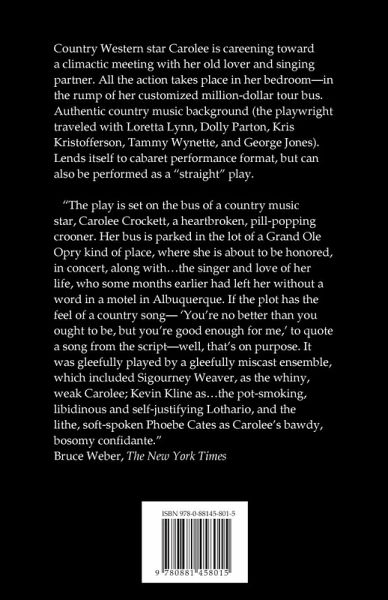 Country Western star Carolee is careening toward a climactic meeting with her old lover and singing partner. All the action takes place in her bedroom-in the rump of her customized million-dollar tour bus. Authentic country music background (the playwright traveled with Loretta Lynn, Dolly Parton, Kris Kristofferson, Tammy Wynette, and George Jones). Lends itself to cabaret performance format, but can also be performed as a "straight" play. "The play is set on the bus of a country music star, Carolee Crockett, a heartbroken, pill-popping crooner. Her bus is parked in the lot of a Grand Ole Opry kind of place, where she is about to be honored, in concert, along with…the singer and love of her life, who some months earlier had left her without a word in a motel in Albuquerque. If the plot has the feel of a country song- 'You're no better than you ought to be, but you're good enough for me,' to quote a song from the script-well, that's on purpose. It was gleefully played by a gleefully miscast ensemble, which included Sigourney Weaver, as the whiny, weak Carolee; Kevin Kline as…the pot-smoking, libidinous and self-justifying Lothario, and the lithe, soft-spoken Phoebe Cates as Carolee's bawdy, bosomy confidante." Bruce Weber, The New York Times