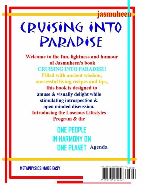 Softcover Version:- CRUISING INTO PARADISE with metaphysical author and artist Jasmuheen is filled with humor, insight, good visuals and practical life enhancing exercises to amuse people of all ages. Designed as an esoteric coffee table book it will prompt introspection, reflection and discussion amongst those interested in the science of successful holistic living and the paradise reality.