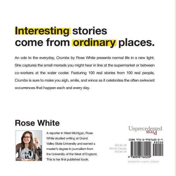 An ode to the everyday, Crumbs by Rose White presents normal life in a new light. Featuring 100 real stories from 100 real people, Crumbs is sure to make you sigh, smile, and perhaps wince once or time.